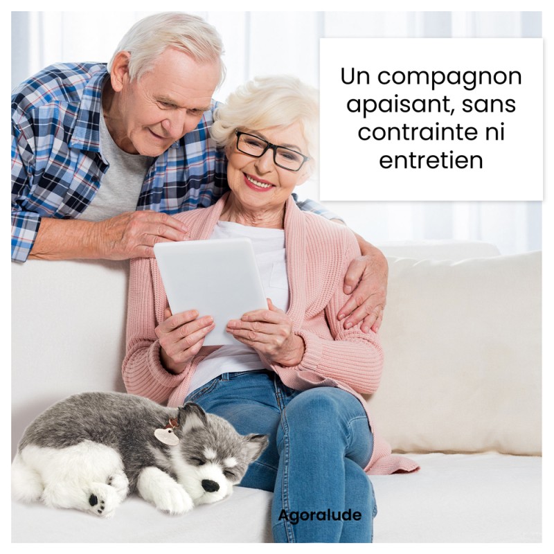Le Perfect Petzzz - Chiot Husky est une peluche réaliste conçue pour apporter réconfort et sérénité, en particulier auprès des personnes âgées atteintes de troubles cognitifs. Allongé dans son panier douillet, ce petit compagnon respire doucement, au rythme naturel d’un vrai animal endormi. Son ventre se soulève et s’abaisse lentement, créant un effet visuel apaisant, idéal pour réduire le stress, la solitude ou l’agitation.