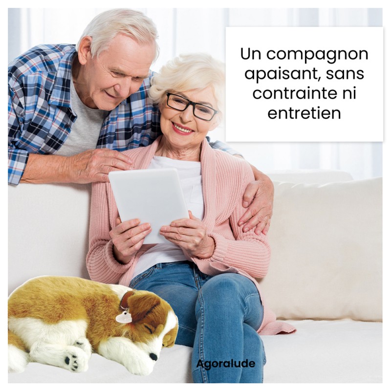 Le Perfect Petzzz - Chiot Collie est une peluche réaliste conçue pour apporter réconfort et sérénité, en particulier auprès des personnes âgées atteintes de troubles cognitifs. Allongé dans son panier douillet, ce petit compagnon respire doucement, au rythme naturel d’un vrai animal endormi. Son ventre se soulève et s’abaisse lentement, créant un effet visuel apaisant, idéal pour réduire le stress, la solitude ou l’agitation.