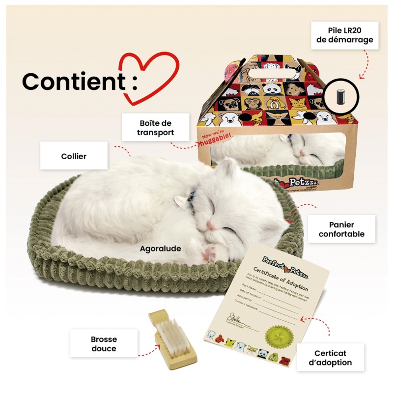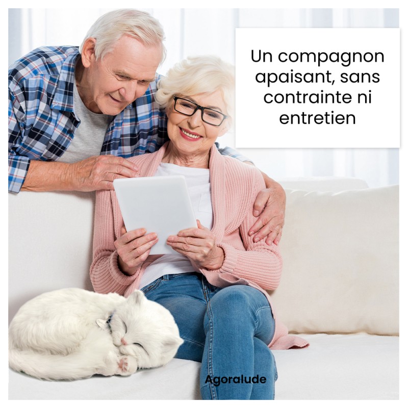 Le Perfect Petzzz - chaton Blanc est une peluche réaliste conçue pour apporter réconfort et sérénité, en particulier auprès des personnes âgées atteintes de troubles cognitifs. Allongé dans son panier douillet, ce petit compagnon respire doucement, au rythme naturel d’un vrai animal endormi. Son ventre se soulève et s’abaisse lentement, créant un effet visuel apaisant, idéal pour réduire le stress, la solitude ou l’agitation.