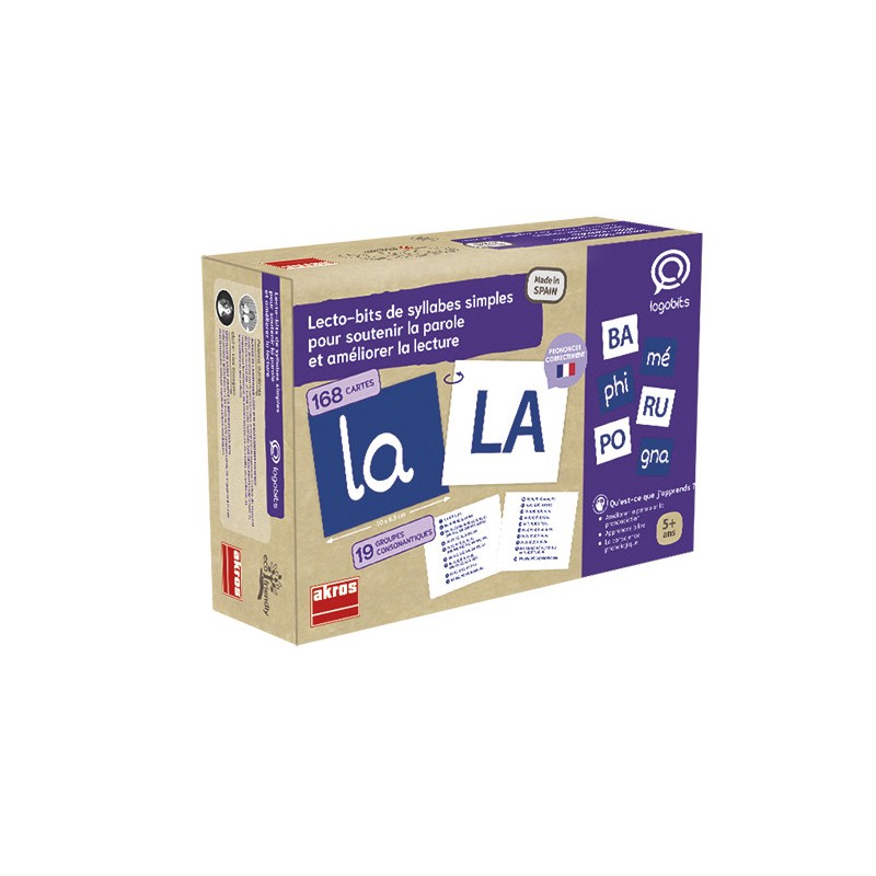 Cartes contenant toutes les syllabes combinées du système phonétique français pour améliorer la reconnaissance des lettres et des sons, et pour fluidifier la tâche de lecture. Ce matériel peut aussi servir à détecter des difficultés sur un phonème concret, de façon à pouvoir le travailler par la suite avec les cartes de la Méthode Logo-Bits correspondantes.