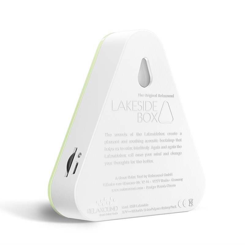 Lakesidebox dans son design vert, est une boite à sons, qui a son approche vous emmène sur le bord d’un lac entouré d'une forêt pour une immersion relaxante instantanée. Le détecteur de mouvement diffuse une ambiance sonore durant 2 minutes.