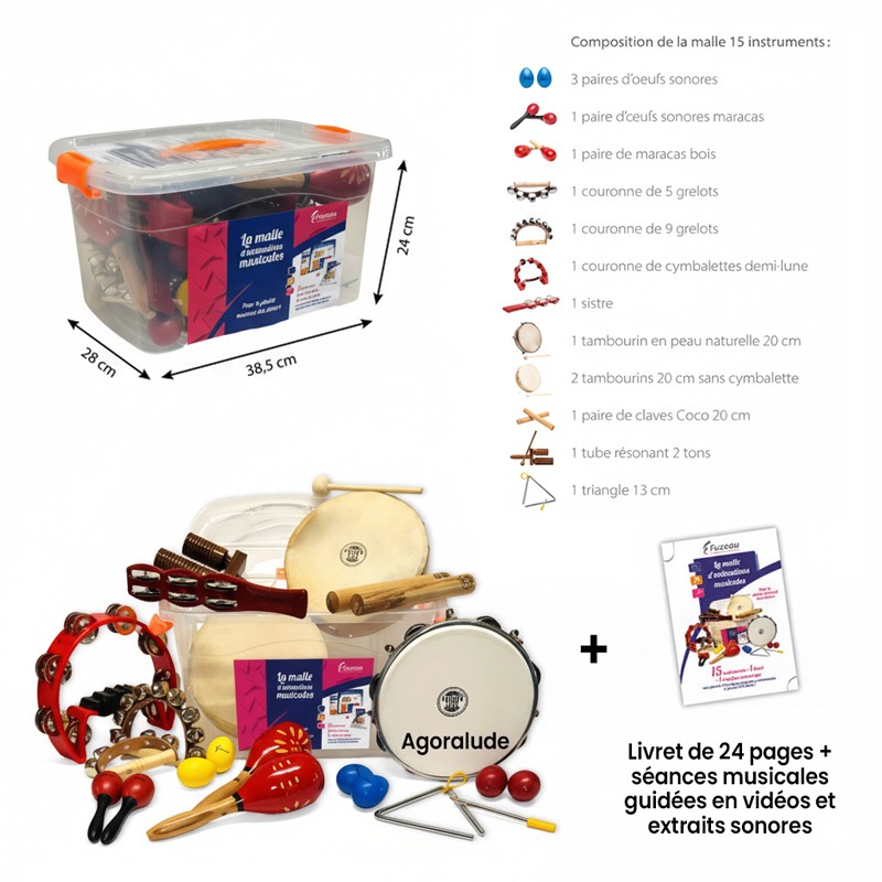 - 15 instruments adaptés : maracas, tambourins, cloches, clés rythmiques… parfaits pour jouer tous ensemble.