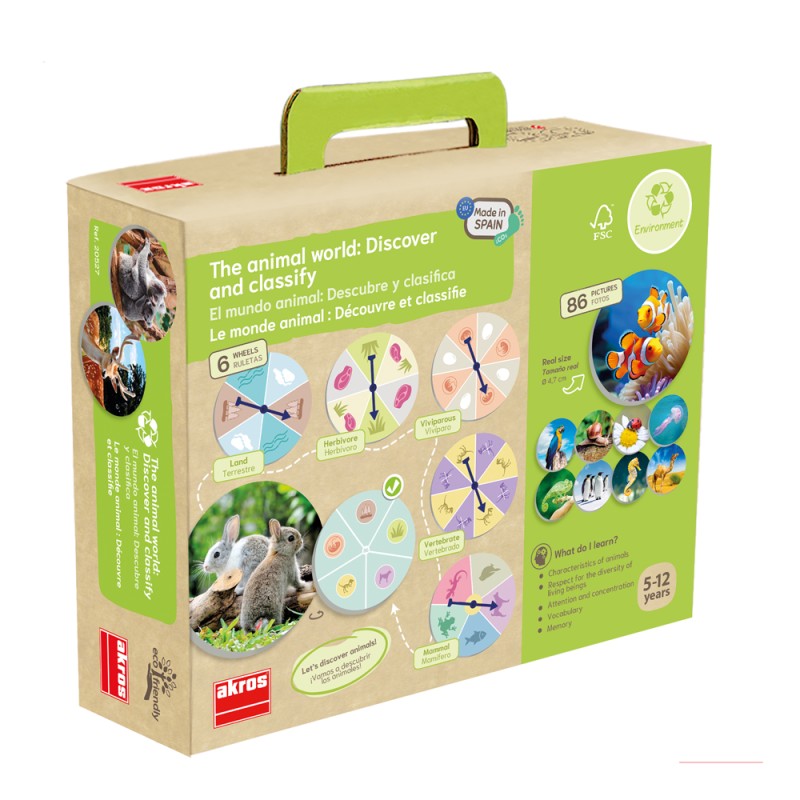 Le jeu Le monde animal - Retrouve et classifie proposent une approche visuelle et tactile pour explorer les grandes familles du règne animal. Grâce à un système de roues à faire pivoter et à un ensemble de tuiles rondes illustrées, les participants sont invités à associer chaque animal à ses caractéristiques : son habitat naturel, son alimentation, sa reproduction ou encore sa structure corporelle.