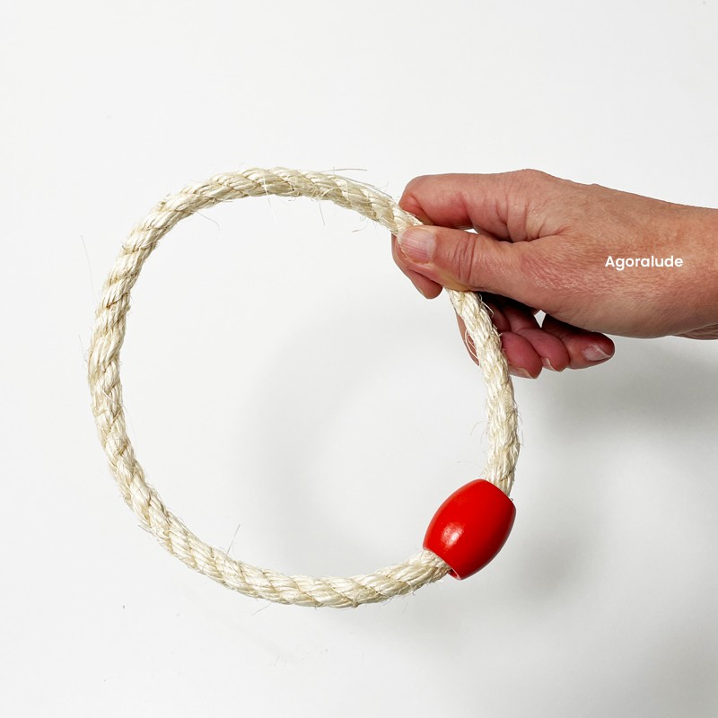 L’ensemble est composé d’une structure en bois robuste de 56 x 56 cm, de 5 anneaux en corde (Ø 15 cm) et d’un sac de rangement en coton, pratique pour le transport et le stockage.