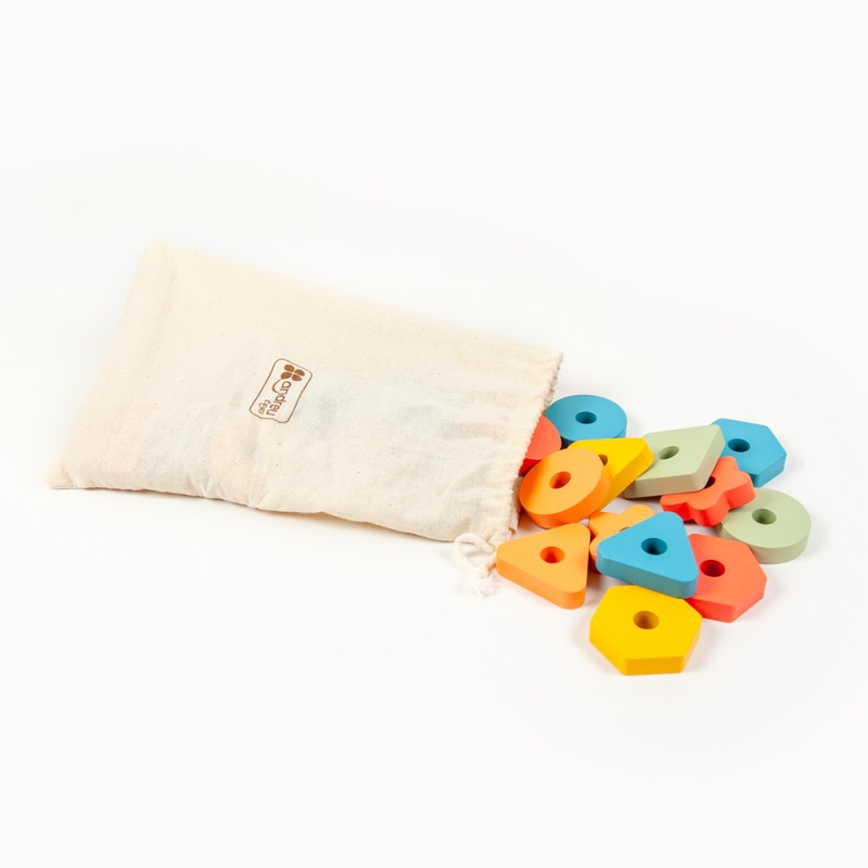 | Contenu | 1 support en bois dim. 30 x 6 x 9 cm, 25 pièces en bois (5 formes dans 5 couleurs) dim. 5 x 5 cm, épaisseur 1,2 cm, 12 fiches modèles recto-verso cartonnées dim. 30 x 7 cm, 1 sac |