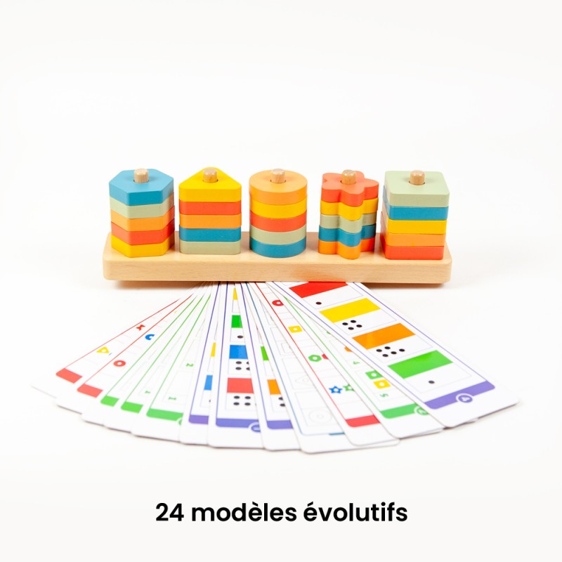 Un jeu d’observation et de manipulation où l’on analyse l’un des 24 modèles pour le reproduire en encastrant les pièces sur les 5 tiges du support en bois, selon les formes, couleurs et positions indiquées. Les pièces en bois sont épaisses ce qui facilite la préhension.