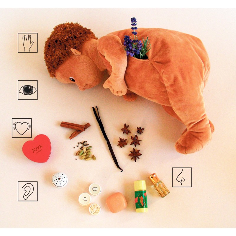 Cette poupée sensorielle est lestée et donne la sensation que l’on tient un enfant dans les bras ou sur les genoux. Posée, elle tient la position assise.